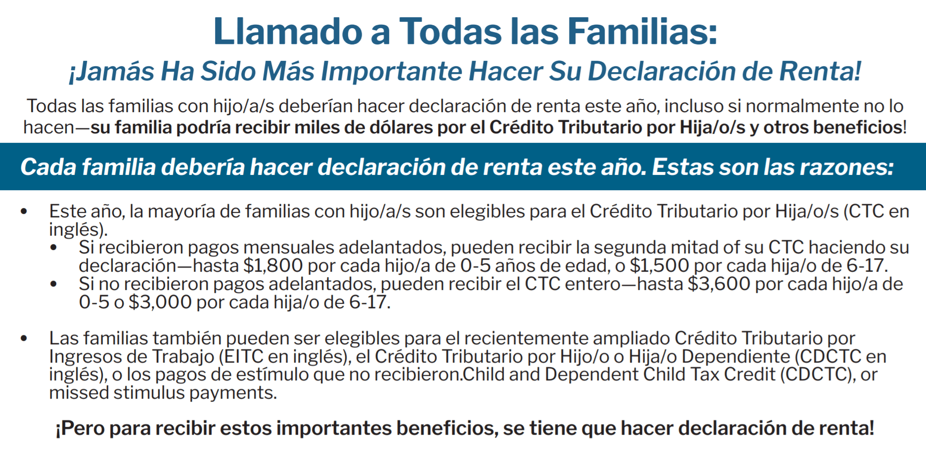New one-page flyers from the Center for the Study of Social Policy, available in both English and Spanish, can help your Agency spread the word about how to claim the Child Tax Credit.