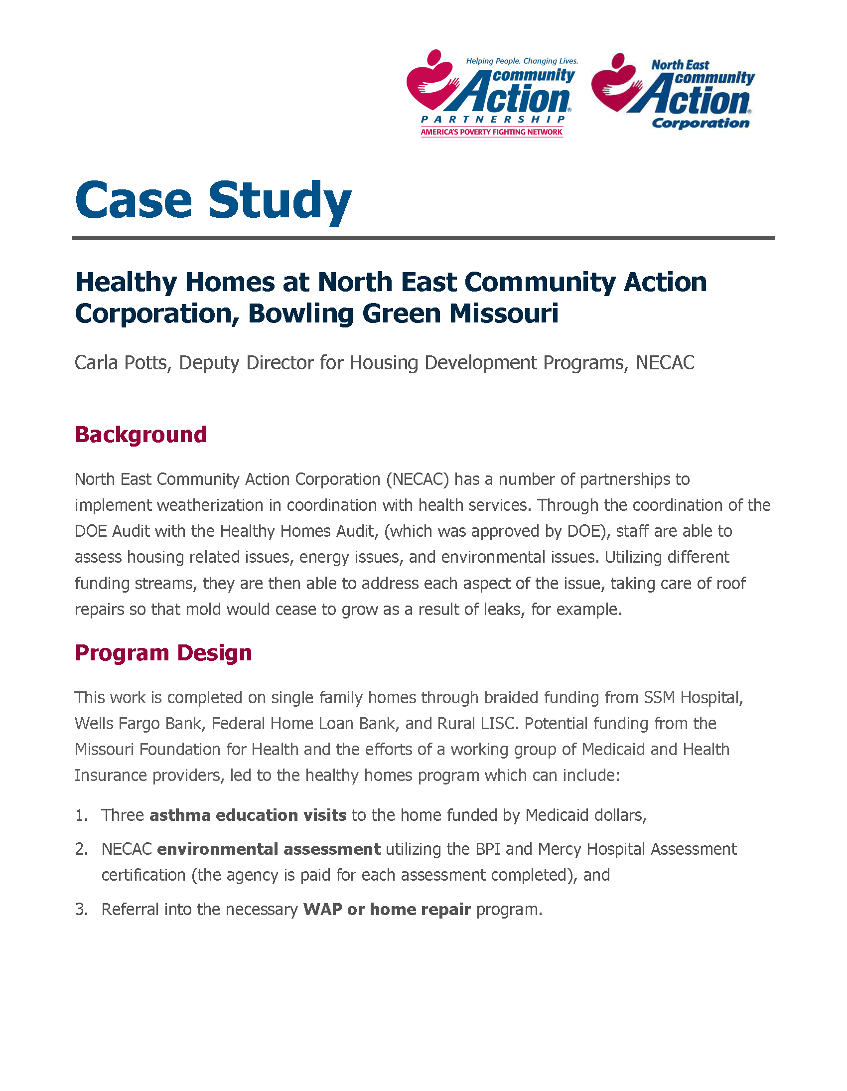 Carla Potts, Deputy Director of the North East Community Action Corporation (the Community Action Agency of Bowling Green, Missouri), shares NECAC’s story related to healthy housing efforts. Such partnerships have included a local hospital and have the potential to include a health insurance provider. Find out how to navigate the maze of who to reach out to in the health sector.